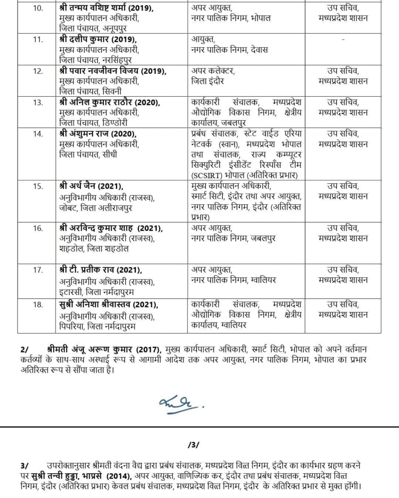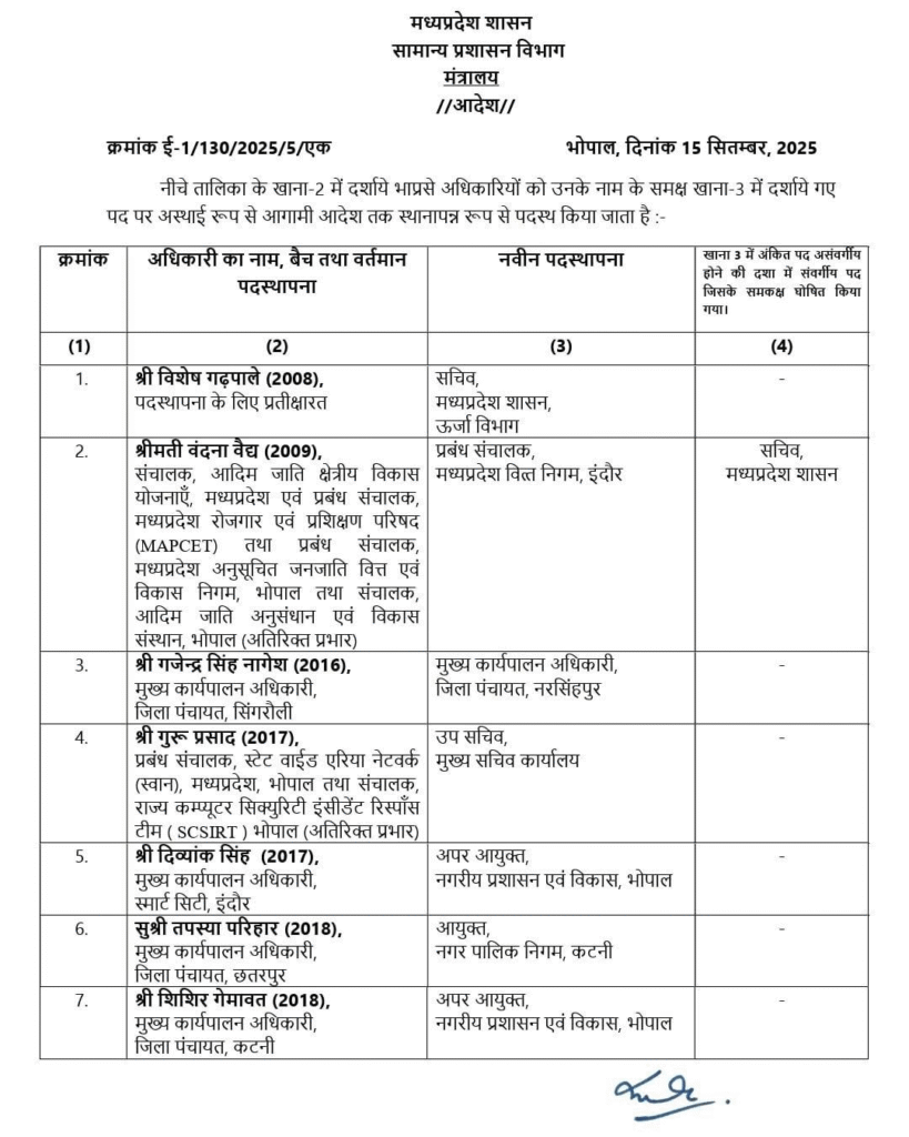 भोपाल।मध्यप्रदेश में सोमवार रात एक बड़ा प्रशासनिक बदलाव देखने को मिला, जिसमें एक साथ 20 आईएएस अधिकारियों का तबादला कर दिया गया। इस फेरबदल के तहत वंदना वैघ को इंदौर वित्त निगम का प्रबंध संचालक (एमडी) नियुक्त किया गया है। वहीं, विशेष गढ़पाले को मध्यप्रदेश शासन एवं ऊर्जा विभाग का सचिव बनाया गया है।इस की लिस्ट भी जारी हो गई है देखें लिस्ट