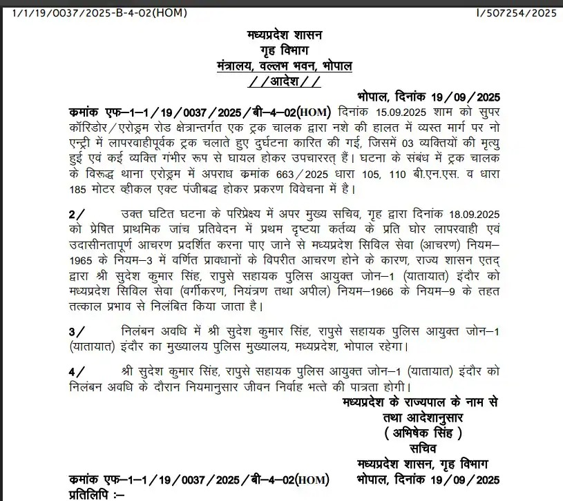 जब इस मामले की जांच हुई तो जांच में अपर मुख्य सचिव (गृह) की रिपोर्ट में पुलिस अधिकारियों की लापरवाही सामने आई है। रिपोर्ट के आधार पर इंदौर के ट्रैफिक एसीपी (जोन-1) सुदेश कुमार सिंह को प्रथम दृष्टया ड्यूटी में गंभीर लापरवाही और उदासीनता का दोषी पाया गया। राज्य शासन ने सिविल सेवा नियमों के तहत कार्रवाई करते हुए सिंह को तत्काल प्रभाव से निलंबित कर दिया है।