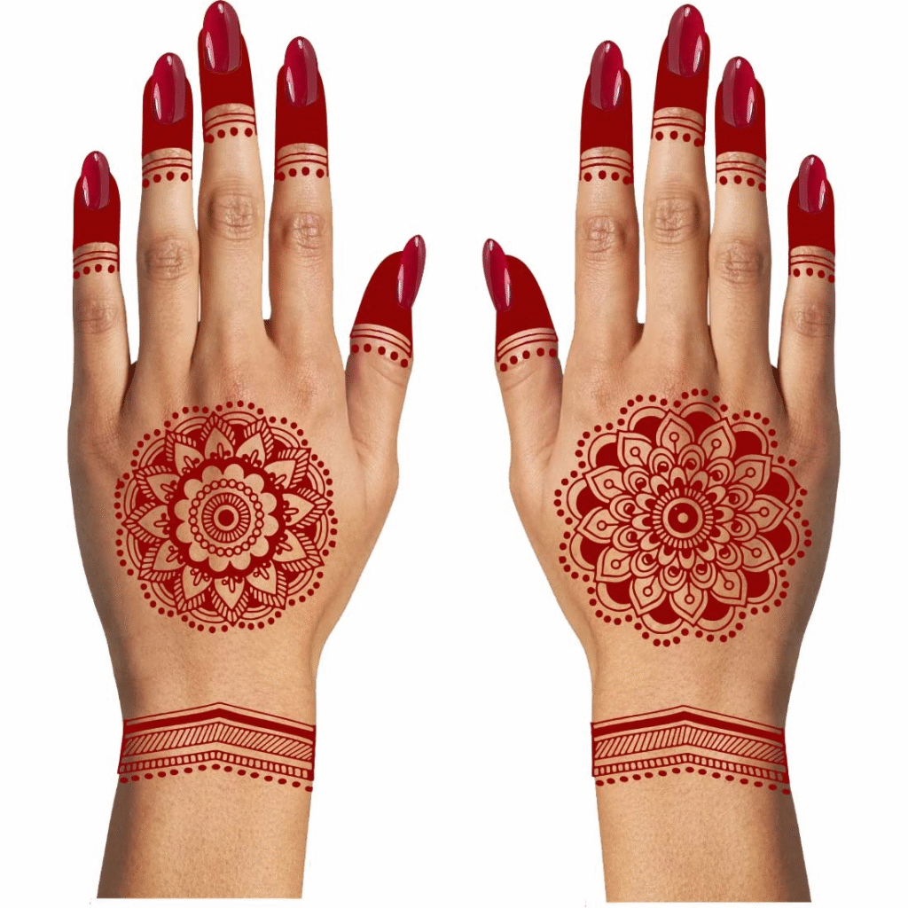 यह बहुत ही आसानी से और जल्दी बनने वाली डिजाइन है. यह डिजाइन आज कल बहुत ही चलन में है। सिर्फ उंगलियों पर छोटी-छोटी बेलें, डॉट्स और मिनिमल डिज़ाइन जल्दी बन जाती है और यह मेंहदी डिजाइन बहुत ही मॉडर्न लुक देती है।