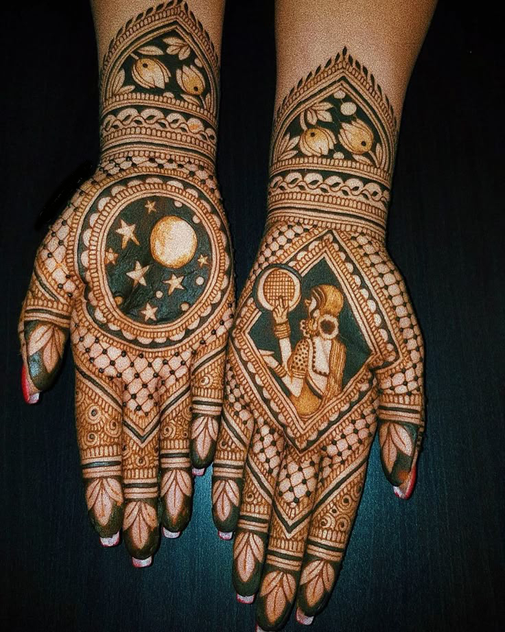 करवा चौथ स्पेशल मेंहदी में चंद्रमा, छलनी, थाली, पति-पत्नी की डिजाइन बनाई जाती है। इसमें पति का नाम या अक्षर मेहंदी में छुपा कर लगवाएं।